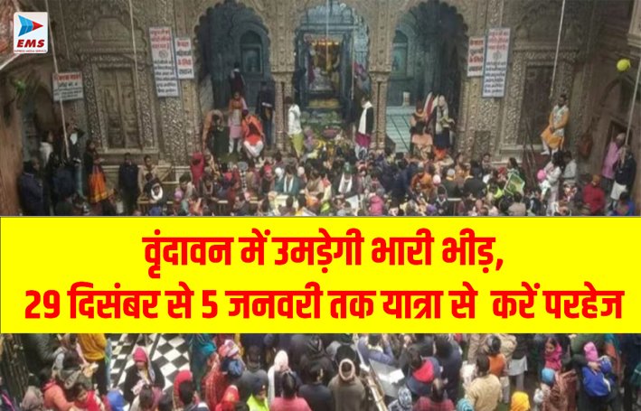 मथुरा । नववर्ष 2026 के अवसर पर ठाकुर श्री बांके बिहारी जी के दर्शन के लिए वृंदावन में भारी संख्या में श्रद्धालुओं के पहुंचने की संभावना को देखते हुए मंदिर प्रशासन और हाई पावर मैनेजमेंट कमेटी ने अहम दिशा-निर्देश जारी किए हैं। प्रशासन ने 29 दिसंबर 2025 से 5 जनवरी 2026 तक अत्यधिक भीड़ रहने की चेतावनी देते हुए श्रद्धालुओं से इस अवधि में वृंदावन यात्रा टालने या भीड़ की स्थिति का आकलन कर ही आने की अपील की है।