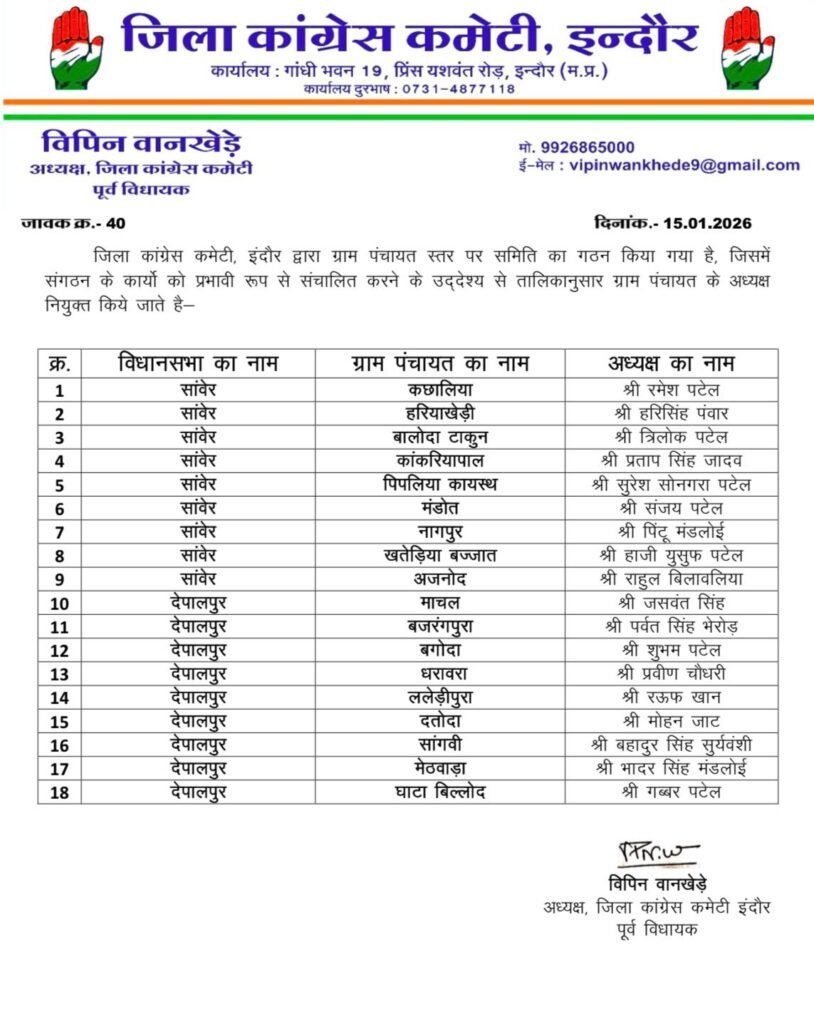 इन्दौर कांग्रेस पार्टी अपने संगठन को जमीनी स्तर पर मजबूत करने की दिशा में लगातार सक्रिय है। इसी क्रम में जिला कांग्रेस कमेटी, इंदौर द्वारा संगठन विस्तार के अंतर्गत ग्राम पंचायत समिति अध्यक्षों की तीसरी सूची जारी की गई। इस सूची के माध्यम से कुल 18 ग्राम पंचायतों में अध्यक्षों की नियुक्ति की गई है, जिसमें सांवेर विधानसभा की 09 ग्राम पंचायतें एवं देपालपुर विधानसभा की 09 ग्राम पंचायतें शामिल हैं। जिला कांग्रेस अध्यक्ष विपिन वानखेड़े ने बताया कि ग्राम पंचायत स्तर पर संगठन को सशक्त बनाना कांग्रेस की प्राथमिकता है, ताकि आम जनता की समस्याओं को मजबूती से उठाया जा सके और पार्टी की नीतियों को घर-घर तक पहुंचाया जा सके। उन्होंने सभी नव-नियुक्त ग्राम पंचायत अध्यक्षों को शुभकामनाएं देते हुए संगठन हित में सक्रिय भूमिका निभाने की अपेक्षा व्यक्त की।
