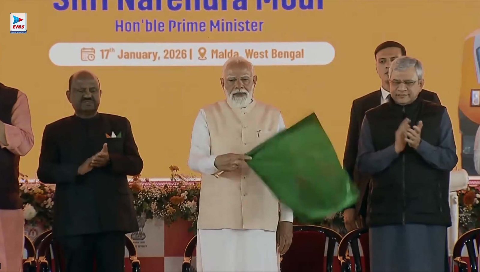 मालदा । पश्चिम बंगाल के मालदा से प्रधानमंत्री नरेंद्र मोदी ने देश की पहली वंदे भारत स्लीपर ट्रेन शुरू की है। प्रधानमंत्री मोदी ने पश्चिम बंगाल के मालदा से ट्रेन को हरी झंडी दिखाई। यह ट्रेन हावड़ा (पश्चिम बंगाल) और कामाख्या (असम) के बीच चलेगी। वंदे भारत के अलावा पीएम मोदी 18 जनवरी को अमृत भारत एक्सप्रेस ट्रेनों को भी हरी झंडी दिखाएंगे। ये अमृत भारत ट्रेन उत्तर बंगाल और उत्तर-पूर्व को दक्षिण भारत से जोड़ेंगी।