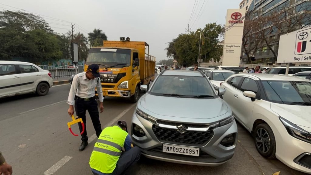 इंदौर । शहर की यातायात व्यवस्था को चुनौती देने वाले शोरूम संचालकों और बेतरतीब पार्किंग करने वालों के विरुद्ध इंदौर ट्रैफिक पुलिस ने गुरुवार को बड़ा अभियान चलाया। पलासिया चौराहा से गीता भवन के बीच मुख्य मार्ग को पार्किंग स्टैंड बनाने वाले शोरूमों के बाहर जब पुलिस का डंडा चला, तो वहां हड़कंप मच गया। नियमों की धज्जियाँ उड़ाकर तीन-तीन कतारों में खड़े किए गए वाहनों पर पुलिस ने मौके पर ही टायर लॉक जड़ दिए।